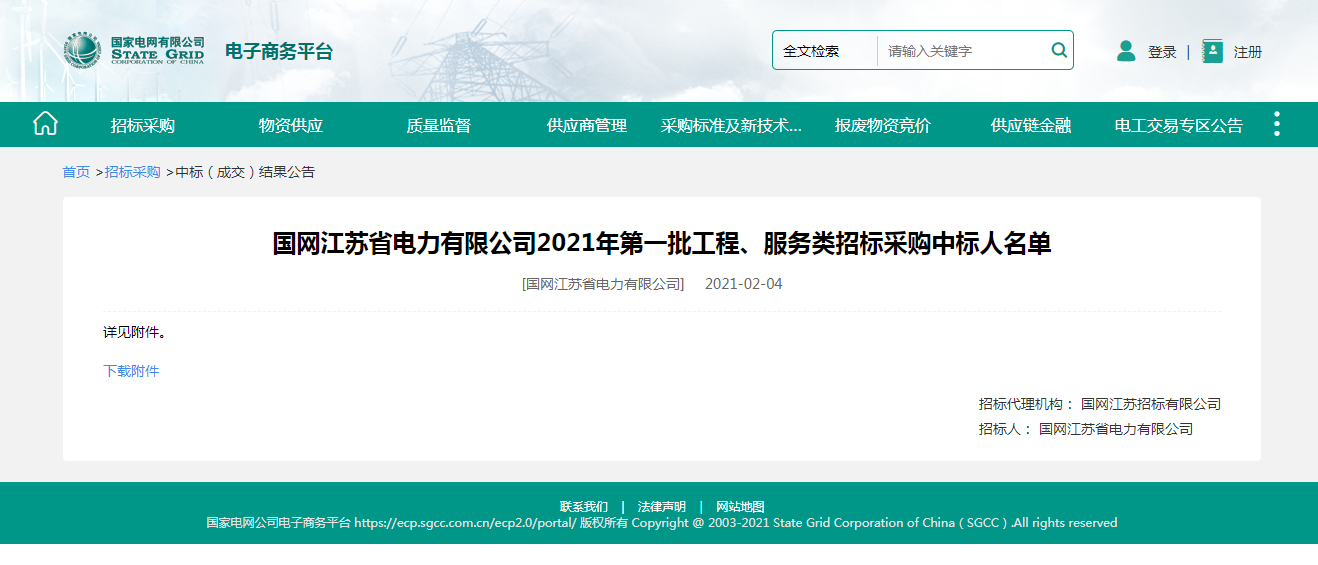 喜報:天津津海天源中標國網(wǎng)江蘇省電力有限公司2021年第一批工程、服務(wù)類招標采購項目